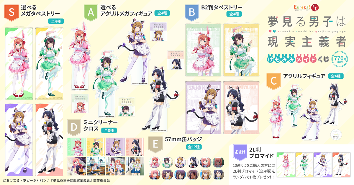 Eureka!オンラインくじにて、2023年7月より放送中のTVアニメ「夢見る男子は現実主義者」のオンラインくじの発売が決定しました! けもみみメイド姿の「夏川愛華」「芦田圭」「佐城楓」「四ノ宮凛」の描き下ろしイラストグッズが当たります! 10連購入で2L判ブロマイドをランダムで1枚プレゼント。